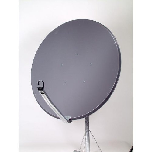 Graphitfarbene Satelliten-Parabolantenne mit einem Durchmesser von 100 Zentimetern und einem galvanisiert und pulverbeschichtetem Reflektor aus Aluminium.. stabiler Tragarm mit Feedhalterung. Antennenrücken in Spiegelfarbe pulverbeschichtet. El-/Az-Masthalterung feuerverzinkt. U-Bügel aus Edelstahl. montagefreundlich