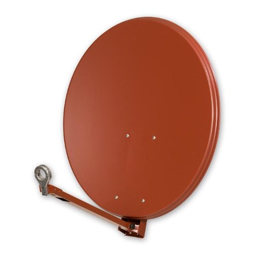 Ziegelrote Premium-Satelliten-Parabolantenne mit einem Durchmesser von 83 Zentimetern, hoher Stabilität, satter Empfangsstärke, extremer Korrosionsfestigkeit und maximalem Vormontagegrad.Antenne befestigen, Feedarm einrasten, mit Knebelschraube sichern, LNB einklicken, Kabel anschließen und die Antenne ist zum Ausrichten empfangsbereit. Der Reflektor besteht aus polyesterbeschichtetem Aluminium, die in Spiegelfarbe beschichteten Rückenhalter aus sendzimir-bandverzinktem Stahl, der Feedarm mit dem 40 mm Feedhalter aus Aluminium, die Flügelmuttern sind geometbeschichtet und der Spannbügel ist aus Edelstahl (Inox).. Feedarm und Rückenteil mit Kabeleinführung. Richtskala zur Bestimmung des Elevationswinkels. Rückenteil, Feedarm und Masthalterung vormontiert und zusammengeklappt. einfache Montage, keine Einzelteile. Inbusschlüssel für den Feedhalter im Lieferumfang enthalten und verlustsicher am Rückenteil befestigt. zukunftssichere Technik, erstklassige Qualität und attraktives Preis-/Leistungsverhältnis. 69 % Wirkungsgrad. 24 dB Nebenkeulendämpfung. 42 K Rauschtemperatur bei 30° Elevation. 0,66 F/D-Verhältnis. 2,3° Öffnungswinkel bei -3 dB. 21° Offset-Korrekturwinkel. 69° erforderliche Feedausleuchtung. 1,0 mm Reflektormaterialstärke. 21,1 dB/K Gütefaktor