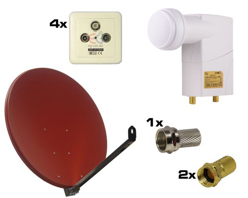 Einkabel Satanlage mit Alu Spiegel 85cm Ziegelrot, Unicable-LNB für 4 Endgeräte, Satdosen & F-Stecker