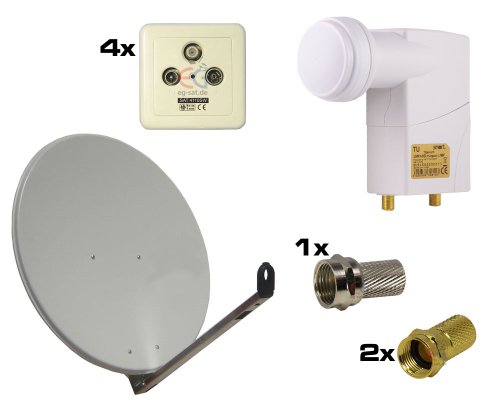 Einkabel Satanlage mit Alu Spiegel 85cm Lichtgrau, Unicable-LNB für 4 Endgeräte, Satdosen & F-Stecker