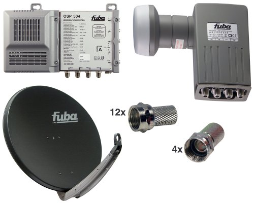 HQ Sat- Anlage für 2 Satelliten (z.B. Astra und Hotbird) und bis zu 8 Teilnehmer (Receiver).High Quality Fuba Spiegel der Spitzenklasse. Durch diverse Tests bestätigt, einer der besten Spiegel am Markt! Höchste Stabilität und beste Empfangswerte zeichnen den Spiegel aus. Die LNB zeigen beste Empfangswerte über das gesamte Frequenzband. Der Multischalter von Fuba ist mit einem Schaltnetzteil ausgerüstet.