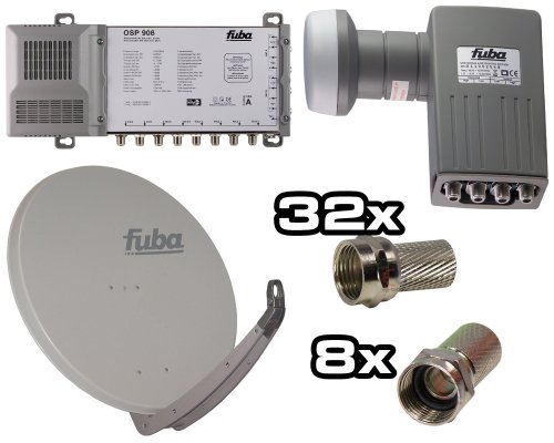 HQ Sat- Anlage für 2 Satelliten (z.B. Astra und Hotbird) und bis zu 8 Teilnehmer (Receiver).High Quality Fuba Spiegel der Spitzenklasse. Durch diverse Tests bestätigt, einer der besten Spiegel am Markt! Höchste Stabilität und beste Empfangswerte zeichnen den Spiegel aus. Die LNB zeigen beste Empfangswerte über das gesamte Frequenzband. Der Multischalter von Fuba ist mit einem Schaltnetzteil ausgerüstet.